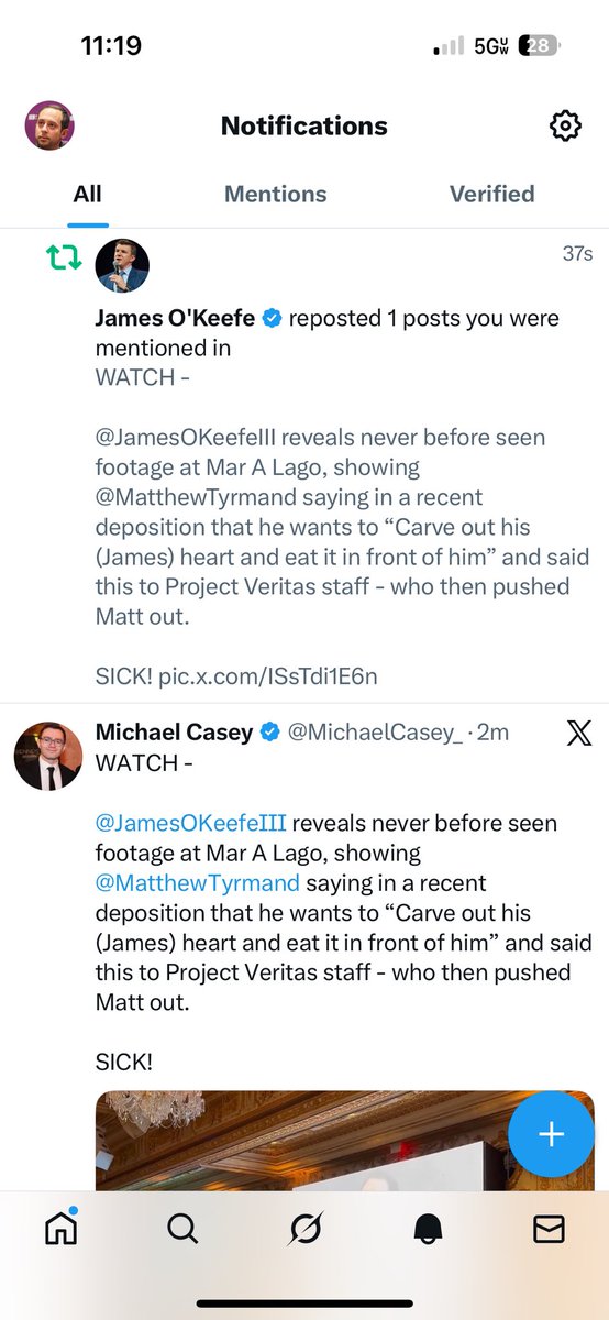 WATCH - @JamesOKeefeIII reveals never before seen footage at Mar A Lago, showing @MatthewTyrmand saying in a recent deposition that he wants to “Carve out his (James) heart and eat it in front of him” and said this to Project Veritas staff - who then pushed Matt out. SICK!