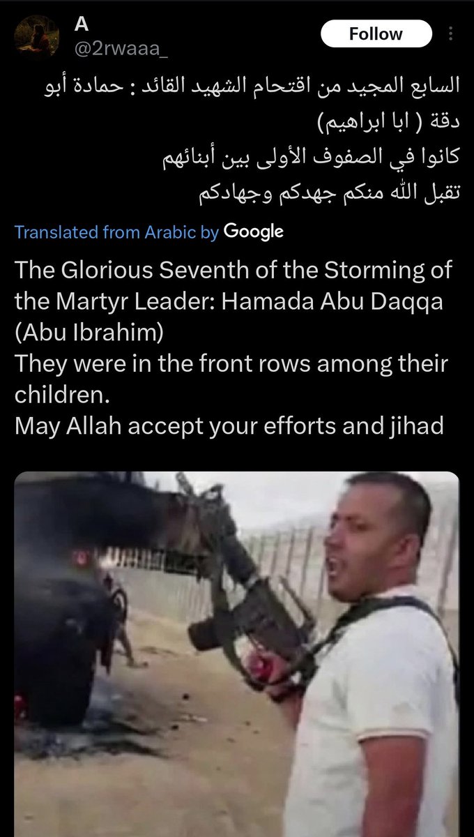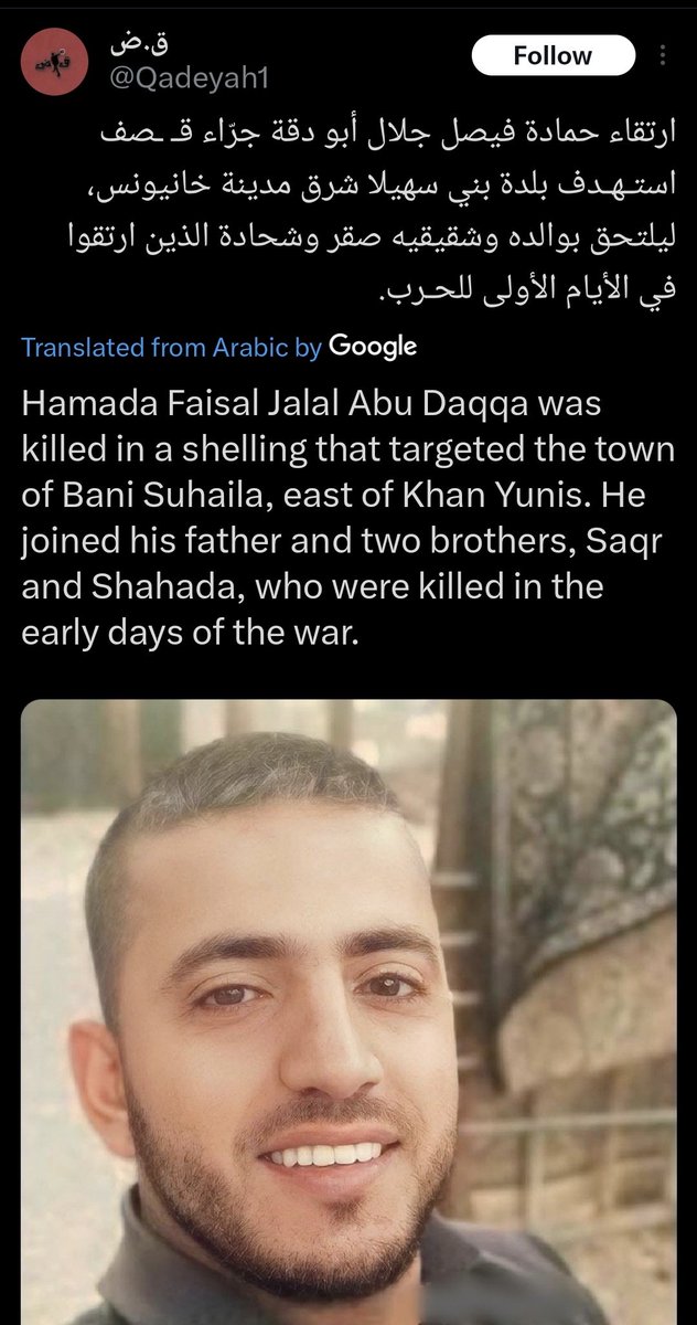 ¹⁹ 02-APR-2025, Bani Suhaila Combatant #34 Hamada Faisal Jalal Abu Daqqa Mentioned as a martyr leader, heroic martyr, and participated in October 7 attack.