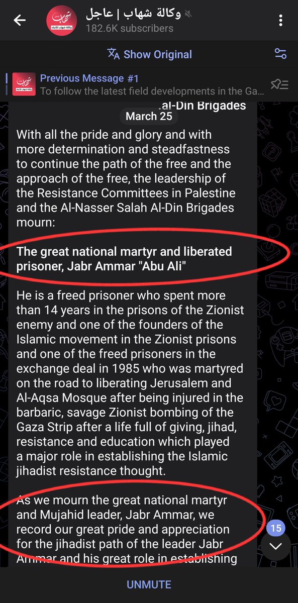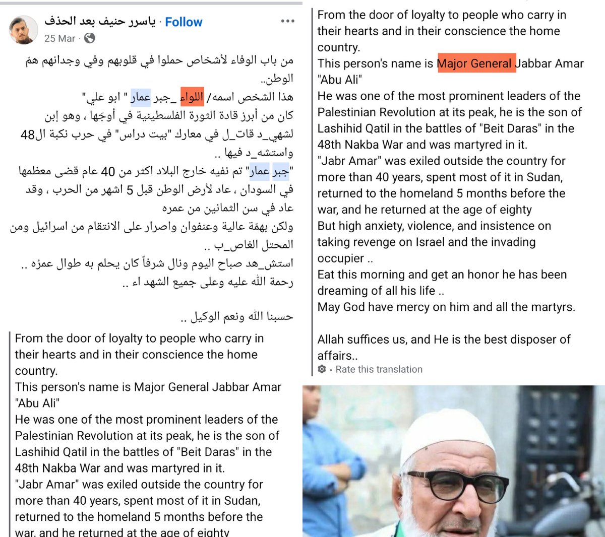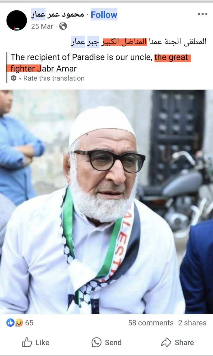 ²² 25-March-2025, Gaza Combatant #37 (Likely local Hamas political leader) Jabr Ammar "Abu Ali" Exiled ex-prisoner. Hamas affiliated leader. Described as Mujahid Leader, Fighter, Major General (al-liwa). Died from wounds. Original strike date/collateral damage is not clear.
