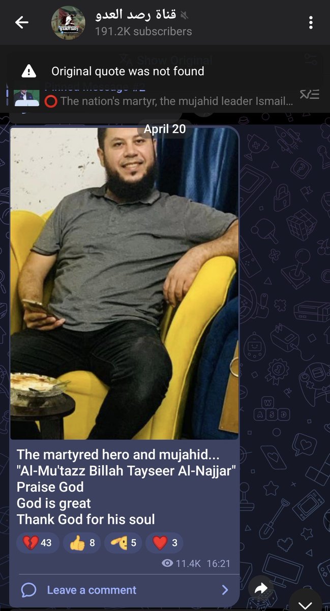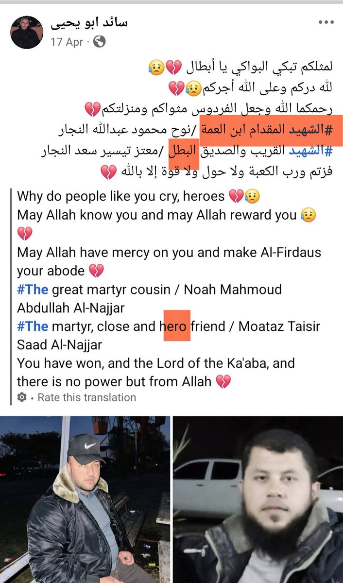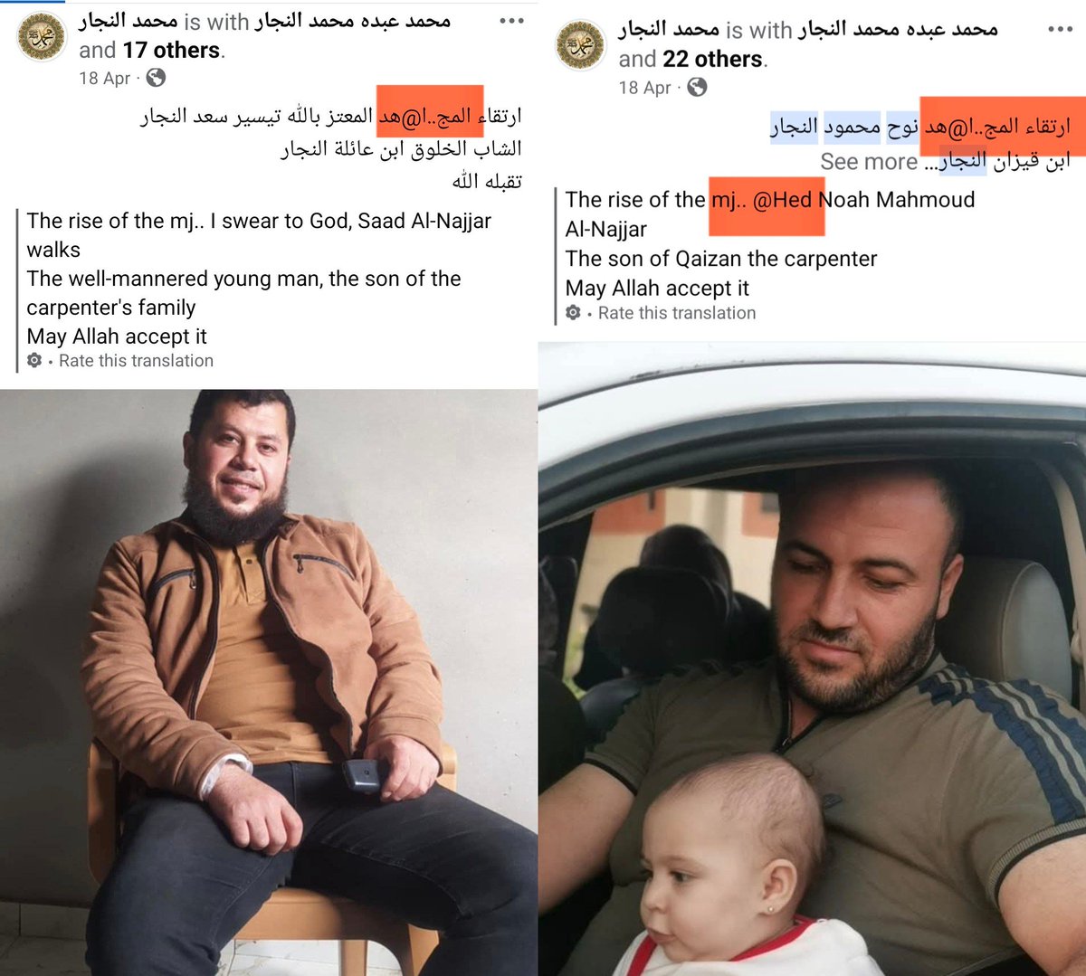 ²⁶ 17-APR-2025, Qizzan Al Najar Combatants #41-#42 Noah Mahmoud Abdullah Al-Najjar Moataz Bellah Tayseer Al-Najjar They are relatives, both mentioned as mujahids and heroic martyrs, al-muqaddam (brave, daring one) Pay attention: "Mujahid" is obfuscation as المج..!@اهد
