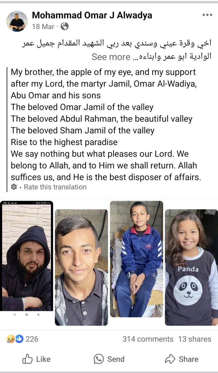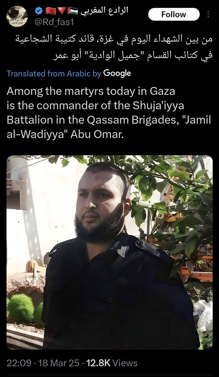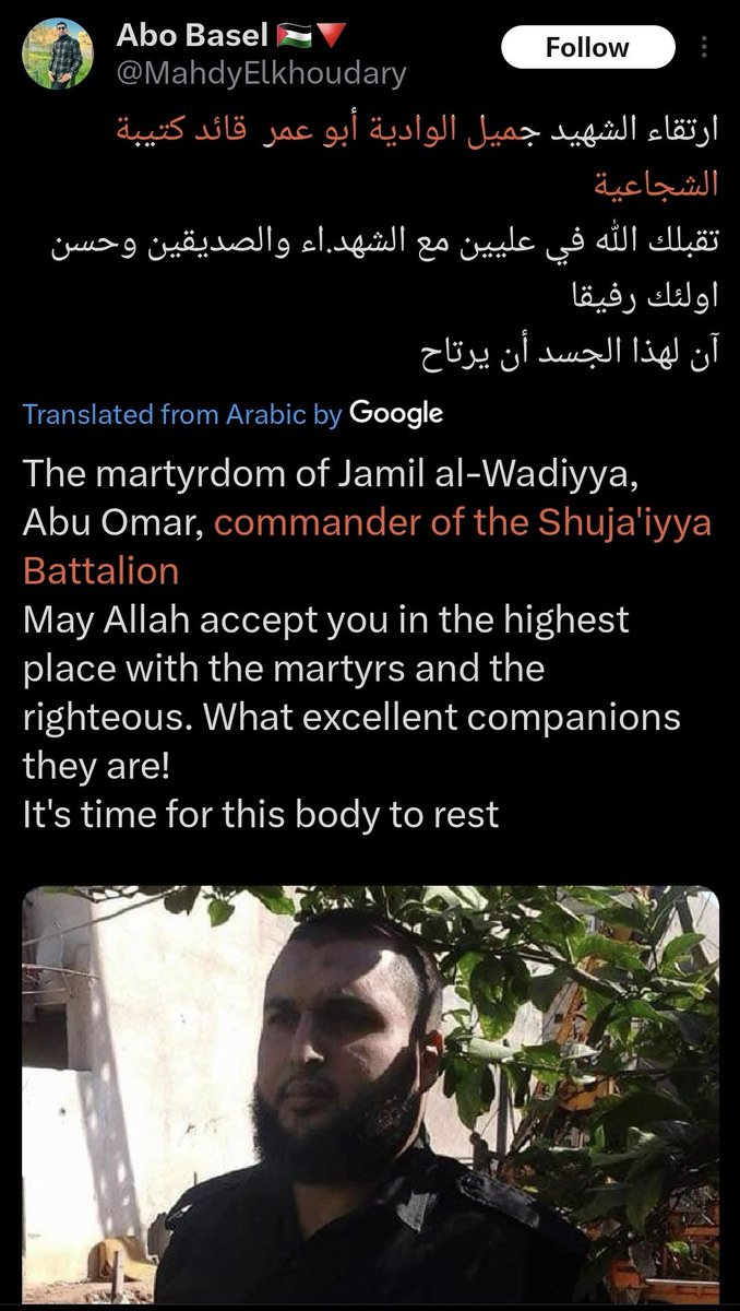 ²⁷ 18-MARCH-2025, Gaza City Shuja'iyya Combatant #43 Jamil al-Wadiyya "Abu Omar, commander of the Shuja'iyya Battalion. "Mujahid Leader" His three children were killed in the strike along with him.