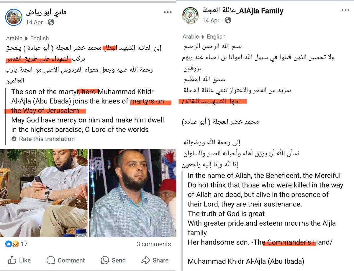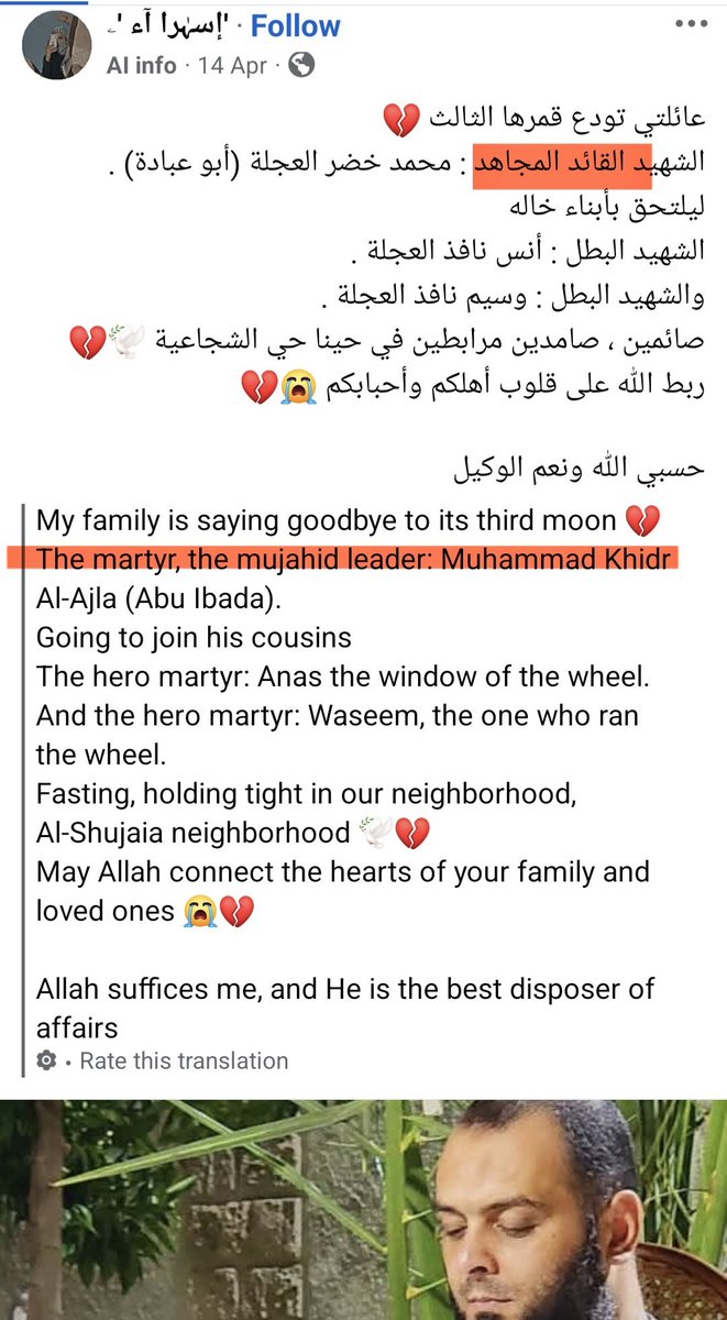 ³³ 14-APR-2025, Gaza City, Shuja'iyya Combatant #53 Mohammed Khader Al-Ajla Mohammed reportedly replaced the Shuja'iyya commander killed weeks earlier. mujahid leader, hero, martyred on the way to Jerusalem The same strike killed his 2 relatives: https://x.com/MiddleEastBuka/status/1917506374772183536?t=ZRbZou_YY5a5rn7QdvWMtQ&s=19