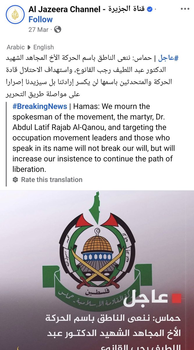 ⁴² 27-MARCH-2025, Jabalia, tent Combatant/Hamas Senior Member #62 Abdel Latif Rajab Jumaa Al-Qanou Hamas Official Spokesman