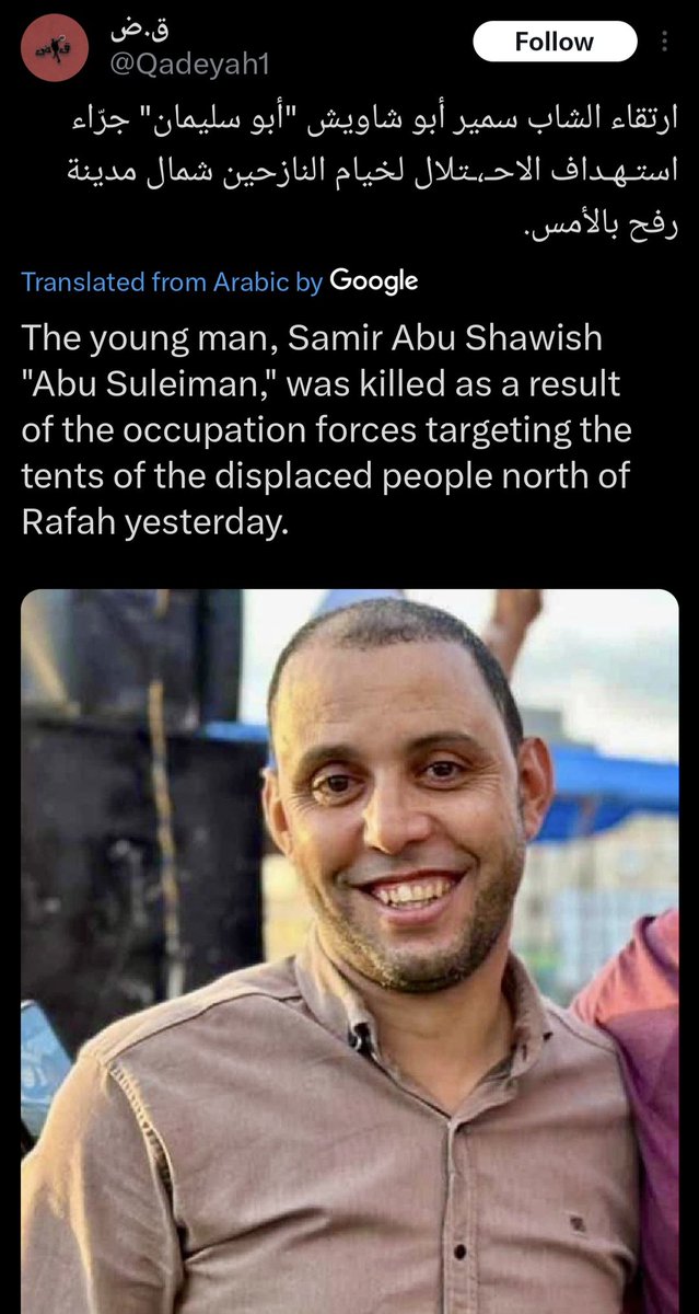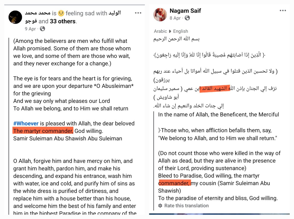 ⁴⁶ 08-APR-2025, Mawasi, tent Combatants #66 Samir Abu Shawish "Abu Suleiman Allegedly commander of Yabna Camp (Rafah) battalion. Mentioned as Leader/Commander Died on the way to Jerusalem Path of Jihad
