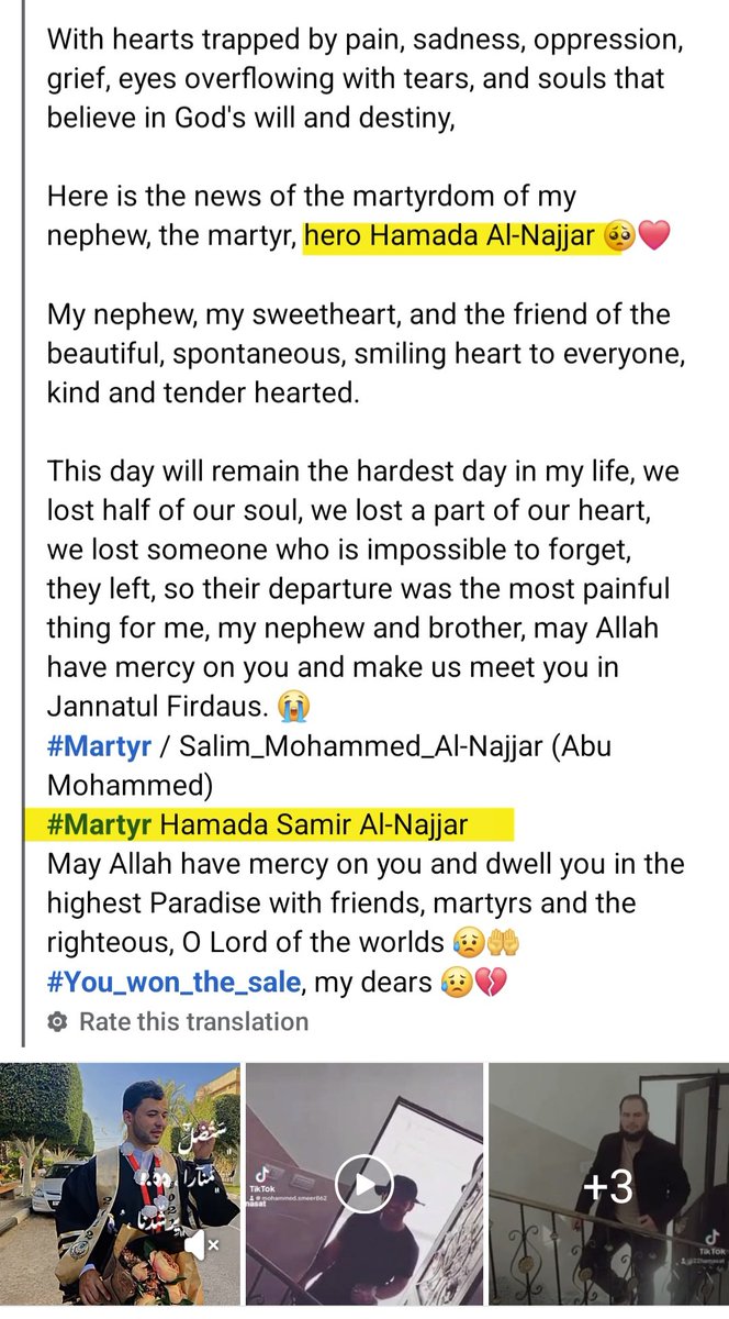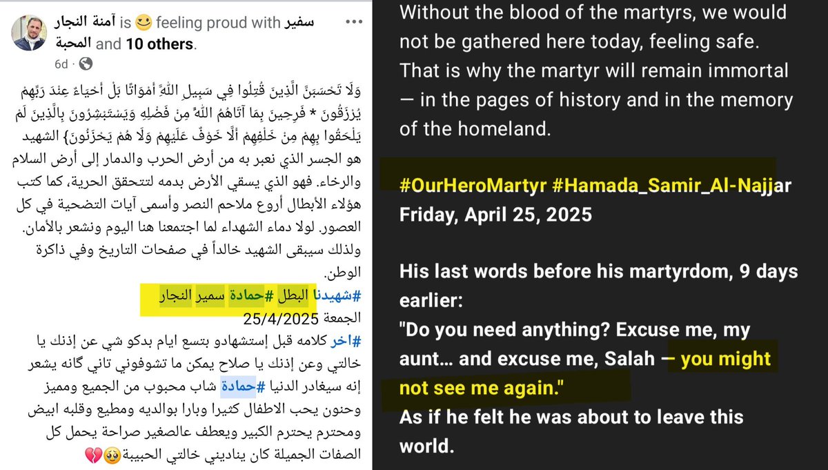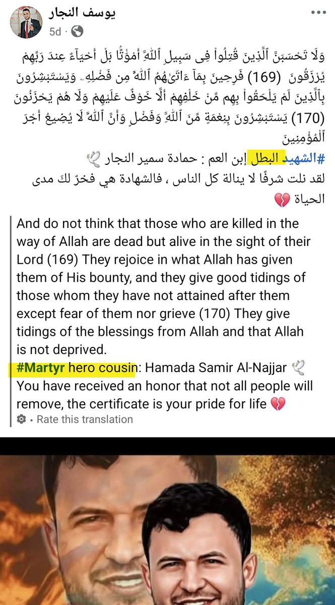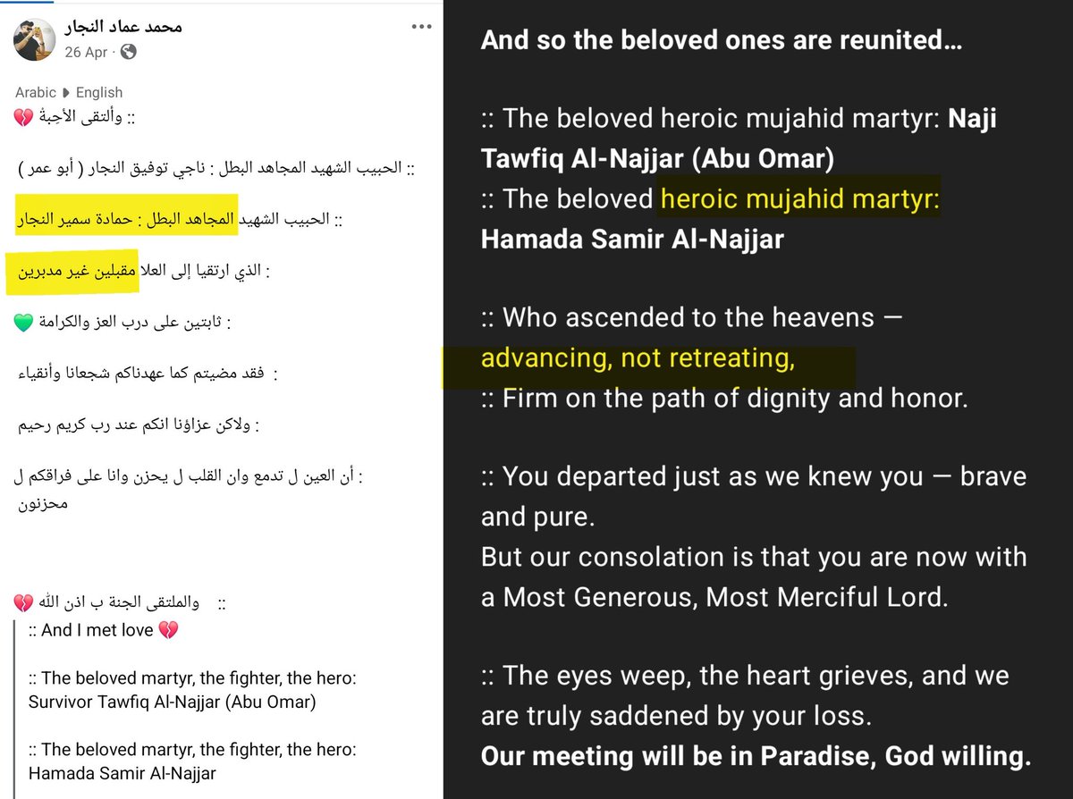 ⁵⁶ 25-APR-2025 Combatant #79 Hamada Samir Mohammed Al-Najjar Mujahid, heroic martyr, advancing and not retreating