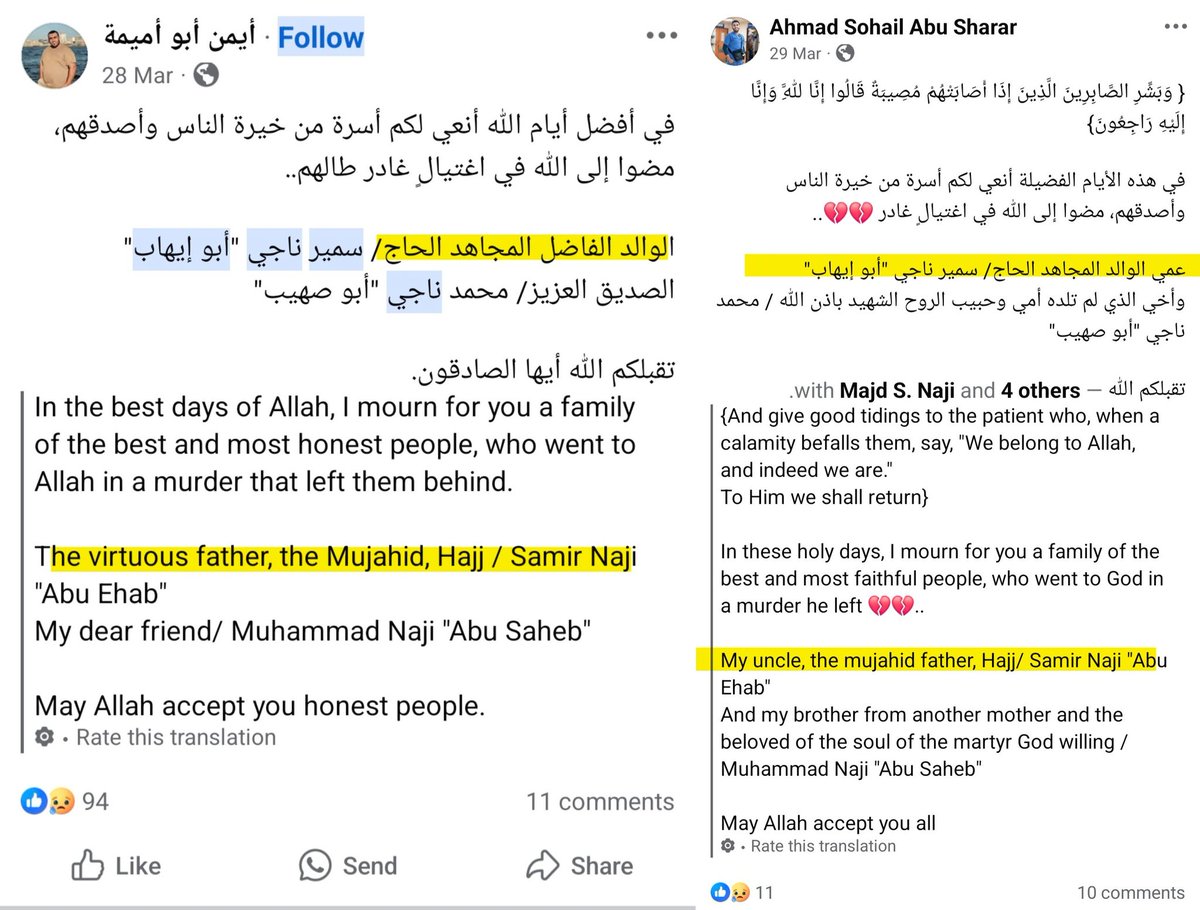 ⁵⁷ 28-MARCH-2025, Jabalia Camp, tent Combatants #80-#82 Samir Musa Naji "Abu Ehab" Muhammad Samir Naji "Abu Saheb" Ayhab/Ihab Samir Musa Naji The father (Samir) was described as a mujahid, a leader/commander, and someone who had resisted the enemy for over 50 years. Two of his sons, also identified as leaders/commanders, were killed in the same strike. Ihab’s child daughter was also among those killed.