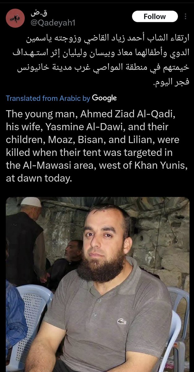 ⁶³ 19-APR-2025, Mawasi, tent Combatant #88 Ahmed Ziad Al-Qadi His wife and their three children were also killed in the same strike on their tent in Al-Mawasi. Mujahid, Martyr on the road to Jerusalem
