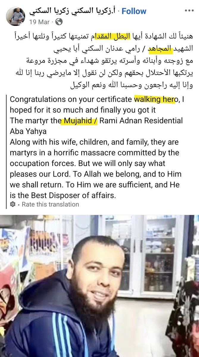 ⁶⁴ 18-MARCH-2025, Gaza City, Tuffah Combatant #89 Rami Adnan Al-Sakani Reportedly Commander at Darj-Tuffah Battalion Mujahid Commander, Heroic Leader, brave (al-muqdam) hero 13(!) family members were killed in this strike (including his wife and 2 of his children)