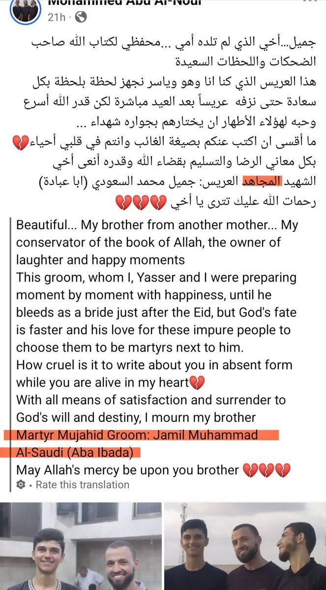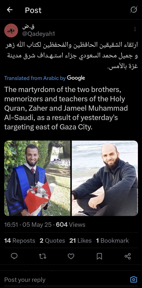 ⁶⁵ 04-MAY-2025, Gaza City Combatants #90-#91 Jameel Muhammad Al-Saudi Zaher Muhammad Al-Saudi (Two brothers) Mujahid, heroic martyrs, advanced and did not retreat, attained the honor of martyrdom on the battlefield.