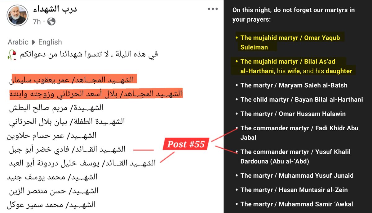 ⁷⁰ 02-MAY-2025, Jabalia Combatants #97-#98 Bilal Asaad Al-Harthani Omar Yaqoub Suleiman Both are called Mujahids. In addition, Omar is mentioned as a heroic martyr joining his martyred mujahid brothers. There is also a very interesting and pretty rare mourning phrase