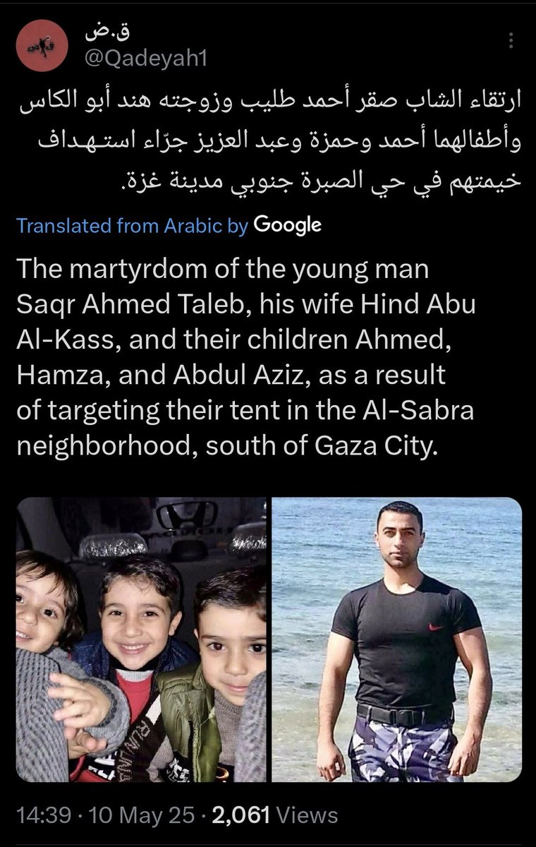 ⁷⁶ 10-MAY-2025, Gaza City. Tent Combatant #107 Saqr Ahmed Taleb Al-Qassami (Hamas Military Wing), commander in sahm (Arrow) unit. Along with him, his wife and 3 of their children were killed.