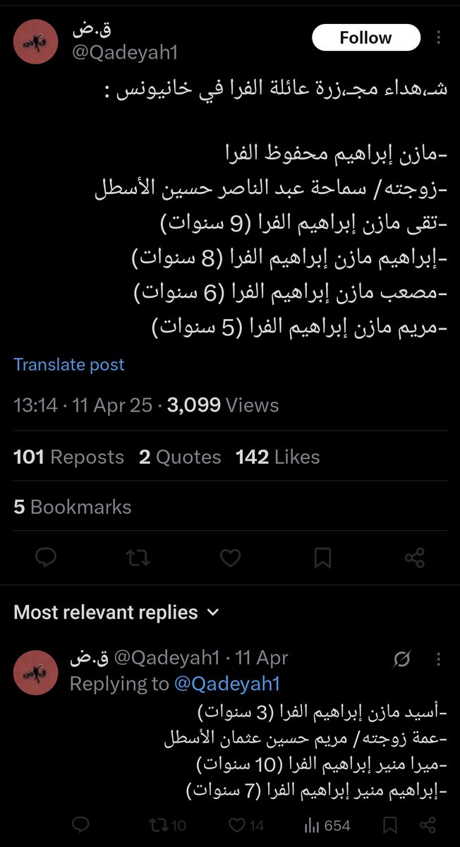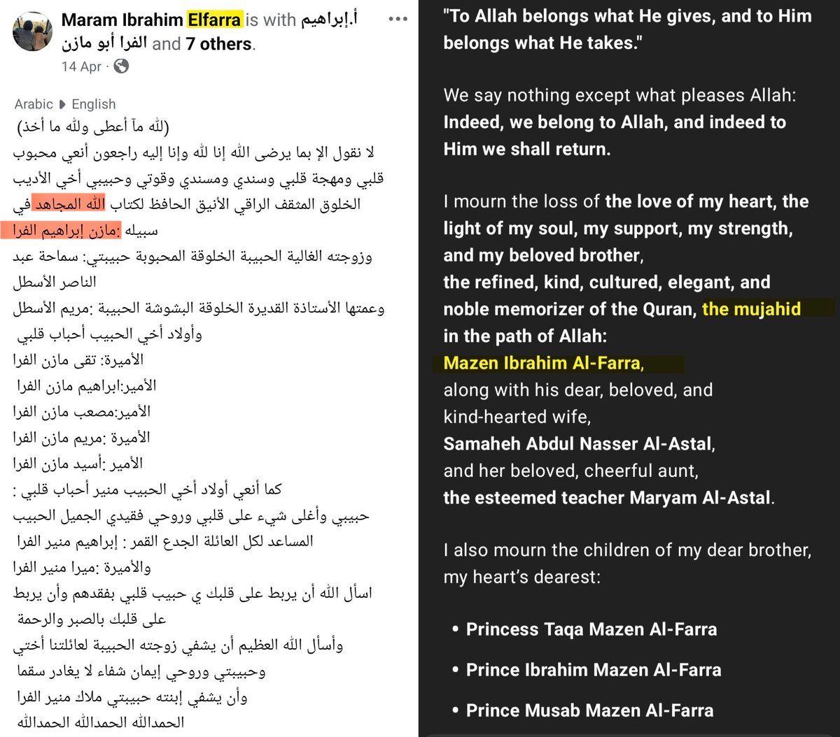 ⁹³ 11-APR-2025, Khan Yunis, House Combatant #136 Mazen Ibrahim Mahfouz Al-Farra مازن إبراهيم الفرا Mentioned by his relative (Al-Farra) as Mujahid His wife, a wife's aunt, five of his children, and two of his brother’s children were killed in this strike.