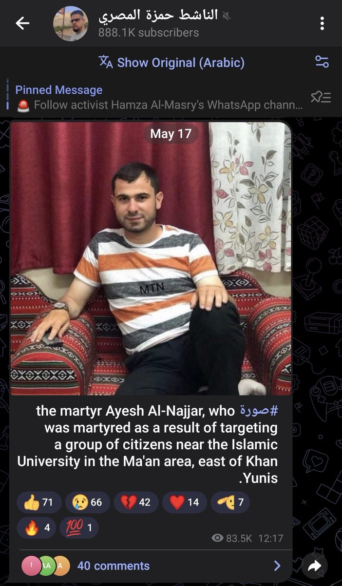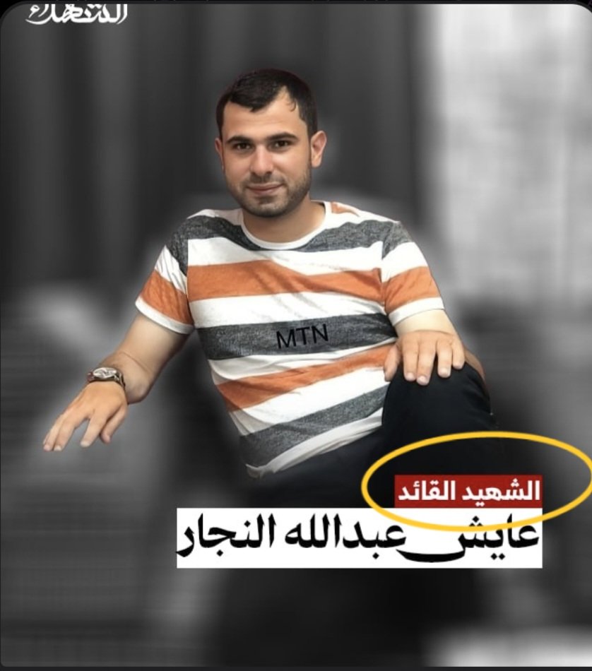 ⁹⁸ 17-MAY-2025, Ma'an area, Khan Yunis Combatant #141 Ayesh Abdullah Al-Najjar عايش عبدالله النجار Heroic fighter (al-munadil al-batal), heroic martyr, Leader/Commander