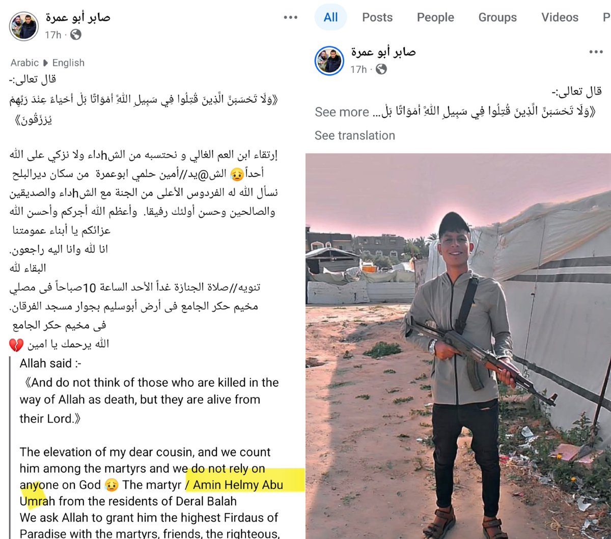 ¹⁰² 17-MAY-2025, Deir al-Balah Combatants #145-#146 Sameh Khaled Abu Miri Amin Helmy Abu Amra أمين حلمي أبو عمرة سامح خالد أبو ميري A close relative posted Amin's mourning photo holding a rifle. Sameh - 'martyred on the road to jerusalem'. His funeral was accompanied by a shooting armed men (merged 2 videos) Another 6 men were killed in the strike.