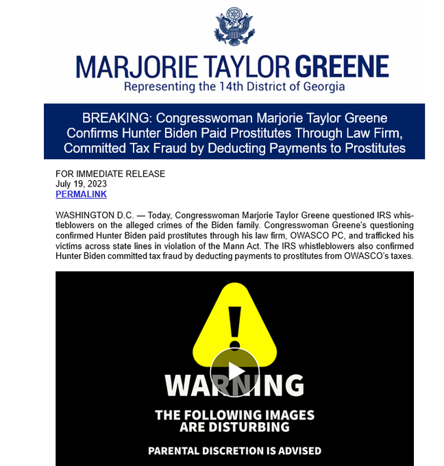 To @Jim_Jordan, Chairman, Select Subcommittee on the Weaponization of the Federal Government: Re: @RepMTG (R-GA) Today, Ms. Greene took it upon herself to present images of a private citizen engaging in sexual acts while under the influence of drugs. Allow me to repeat the important part: A PRIVATE CITIZEN. And oh yeah, she used official, taxpayer-funded resources for this. Not an elected official. Not a spy from a foreign country. Just a guy with a drug problem. Protecting the rights of private citizens from Government officials using their position to harass those citizens -- isn't that the whole point of your dumb subcommittee? Or does it only exist to use government resources to target private citizens related to your perceived enemies? It seems like your Weaponization Committee is as useless as YOU were when you allowed those wrestling boys to be molested and said nothing. Your weaponization committee is WEAPONIZED. If your committee TRULY exists to investigate the weaponization of government, I suggest you start with Marjorie Taylor Greene immediately, or just shut down your whole stupid, impotent subcommittee before you go and lose MORE "whistleblowers," lol. Sincerely, People tired of your party's petty nonsense
