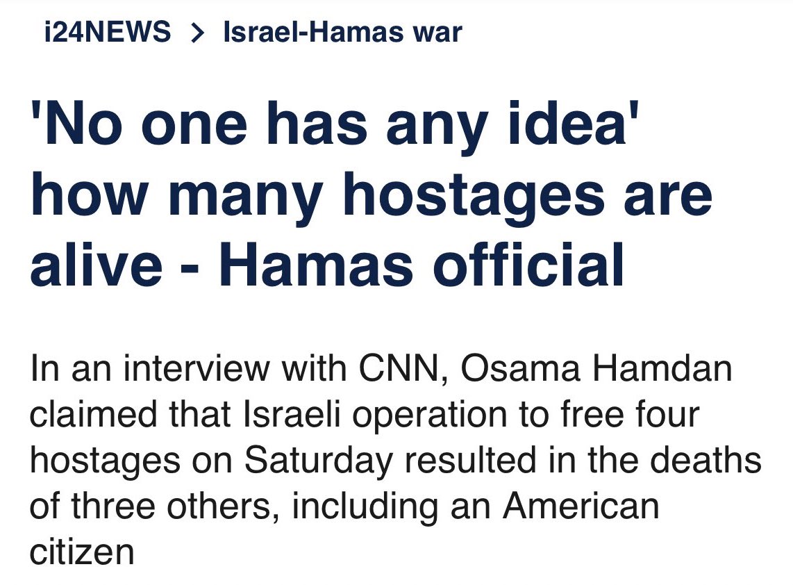 Andrew Fox @mr_andrew_fox · Twitter · 2024-06-14 18:28 UTC They don’t know how many hostages they have or where they are, but their casualty reporting is totally legit and accurate. Got it.