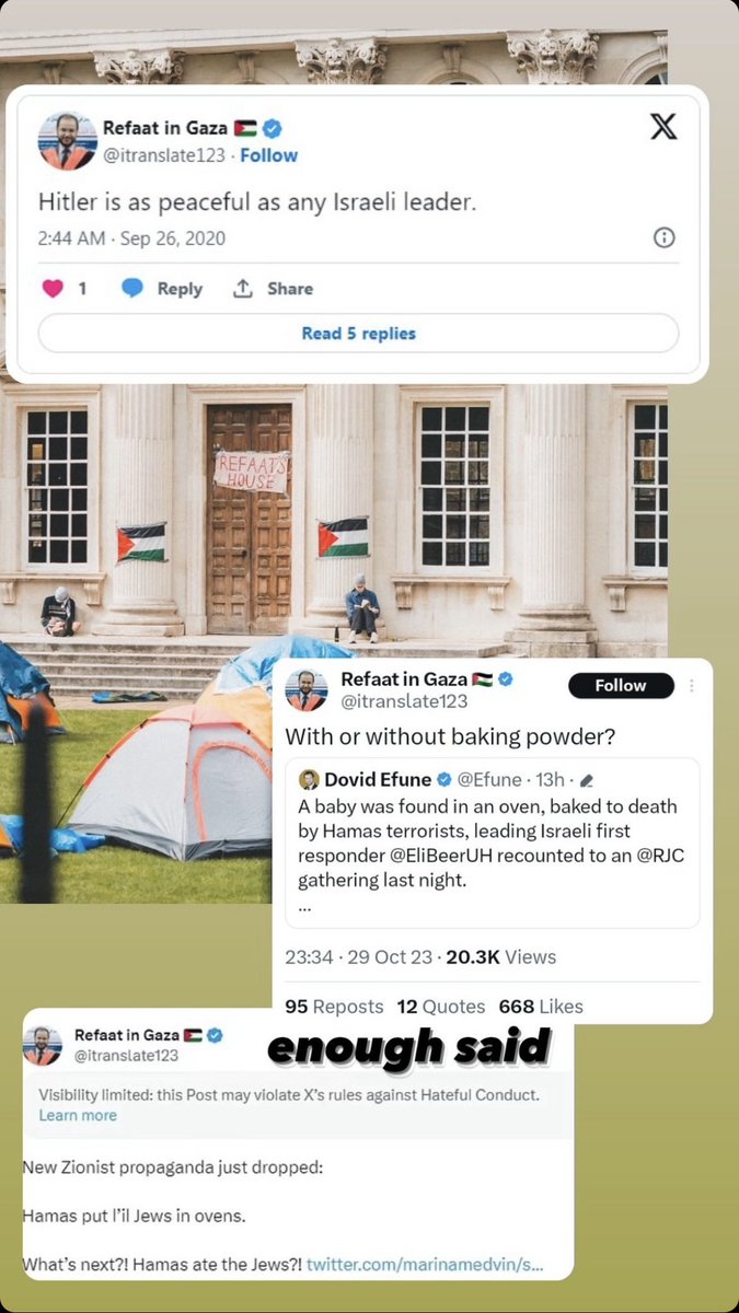 During my Junior Spring abroad last year at Cambridge University students set up an encampment in honor of Refaat Alareer who joked about Israeli babies being burned alive in ovens. Today students occupied a building and renamed it after the mass murderer Ghassan Kanafani!