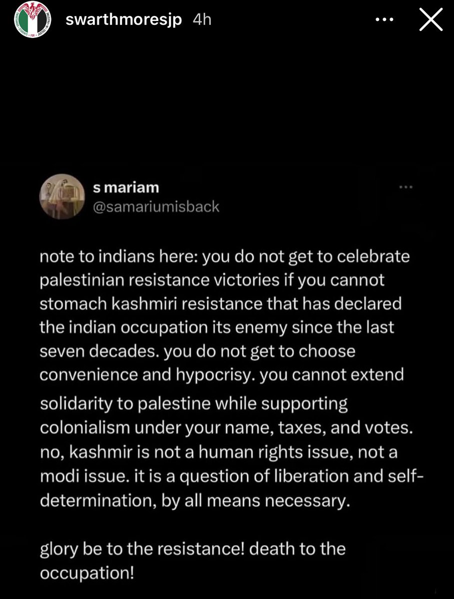 Swarthmore SJP Club posted in support of the terrorist attack in India where Jihadists checked if people were Muslim or not before slaughtering them.