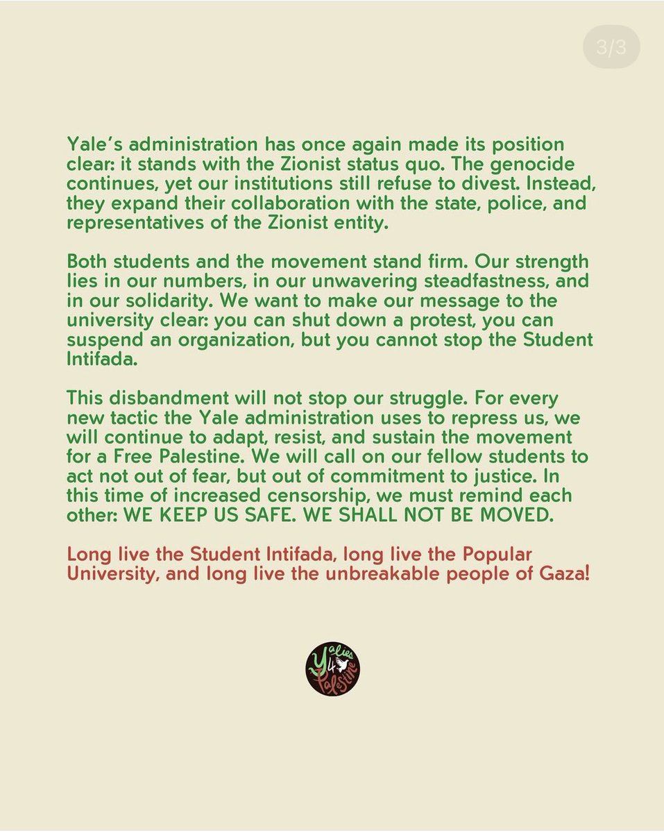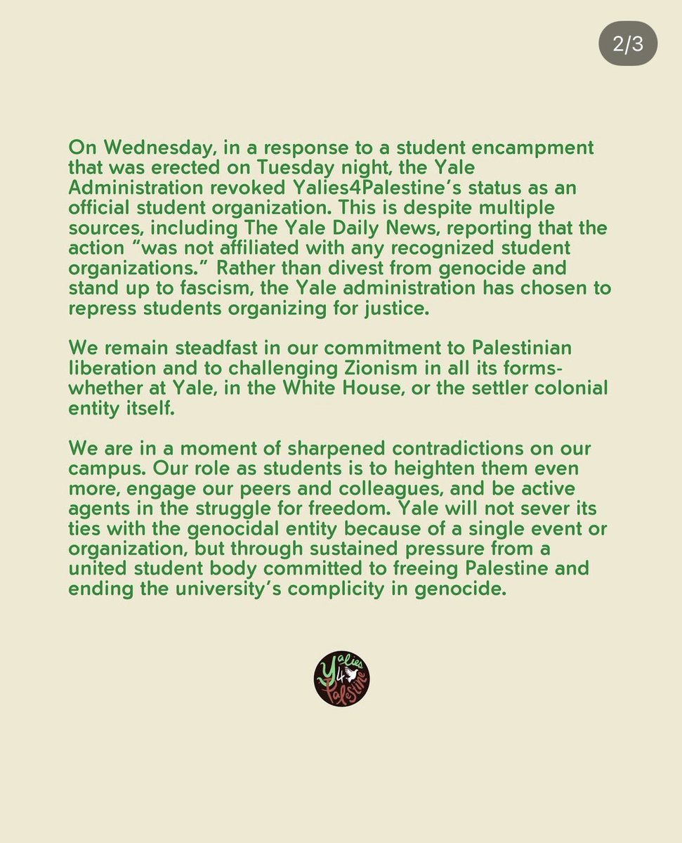 Yalies4Palestine who just lost their status as a Yale student group following their illegal and antisemitic encampment at Yale on Tuesday have now pushed back against school admin in calling for a “student intifada.” These students must be expelled! #defundyale