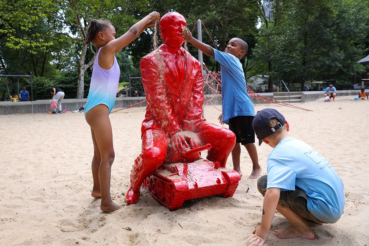 🔴In the heart of Manhattan, an unusual sculpture of Trump emerging from a manhole appeared Under the manhole cover next to the U.S. president, a bright red rat was also spotted. The installation appeared in the city early in the morning, but workers later dismantled the sculpture. 🚨The statue's creator is French artist James Colomina. He places his signature red sculptures in the most unexpected locations. For example, in 2022, he placed a sculpture of Putin riding a tank at one of New York's playgrounds.