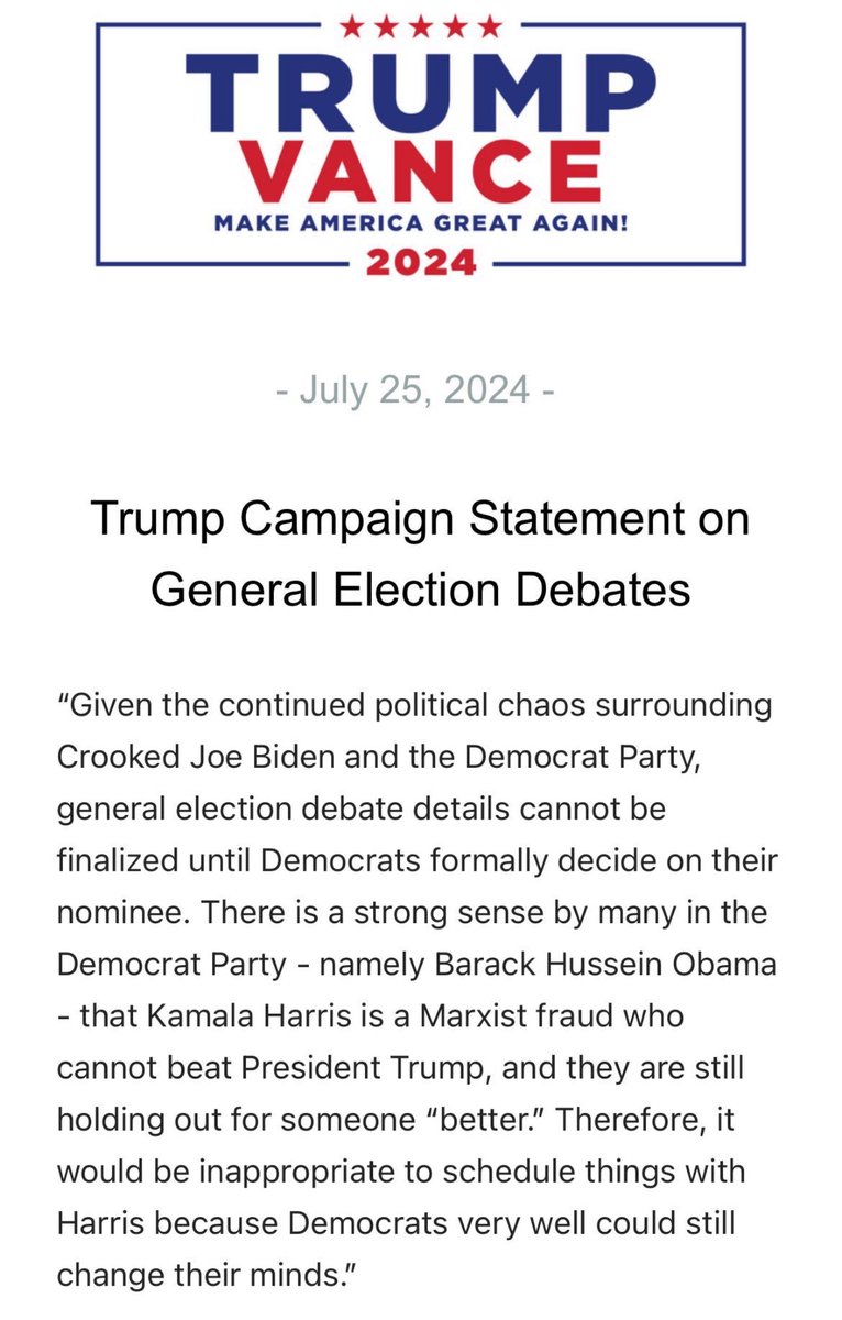 Norm Eisen @normeisen · Twitter · 2024-07-26 02:55 UTC Trump is scared of debating Kamala He should be But you have to ask yourself, if he’s afraid to debate her, how can he be brave enough to take on America’s foreign adversaries?