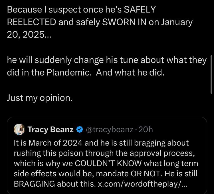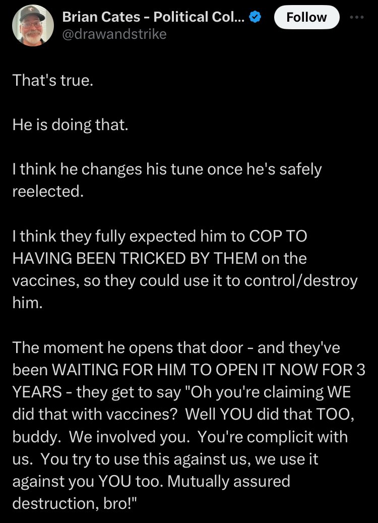 “Trump will admit the vaccine is killing everyone after he wins the election.” So you’re admitting Trump is willingly sending people to the grave so he can win office and you support this?