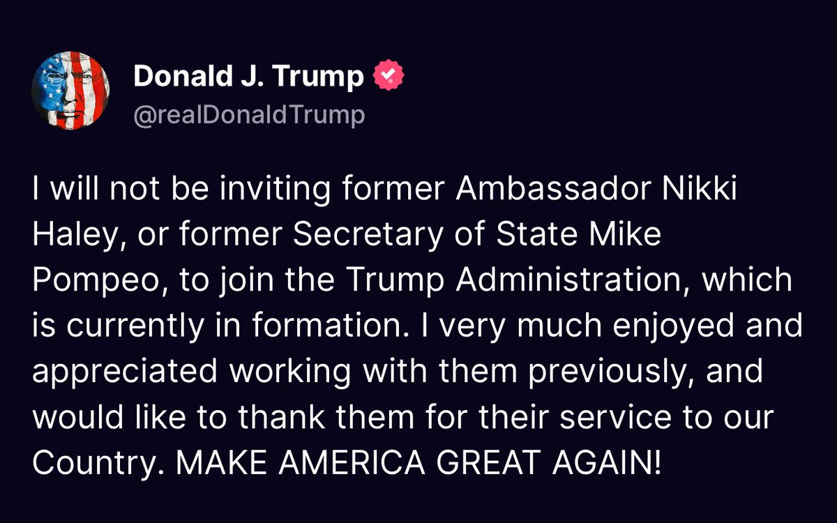 This is great news. Trump doesn’t need any RINOs in his administration.