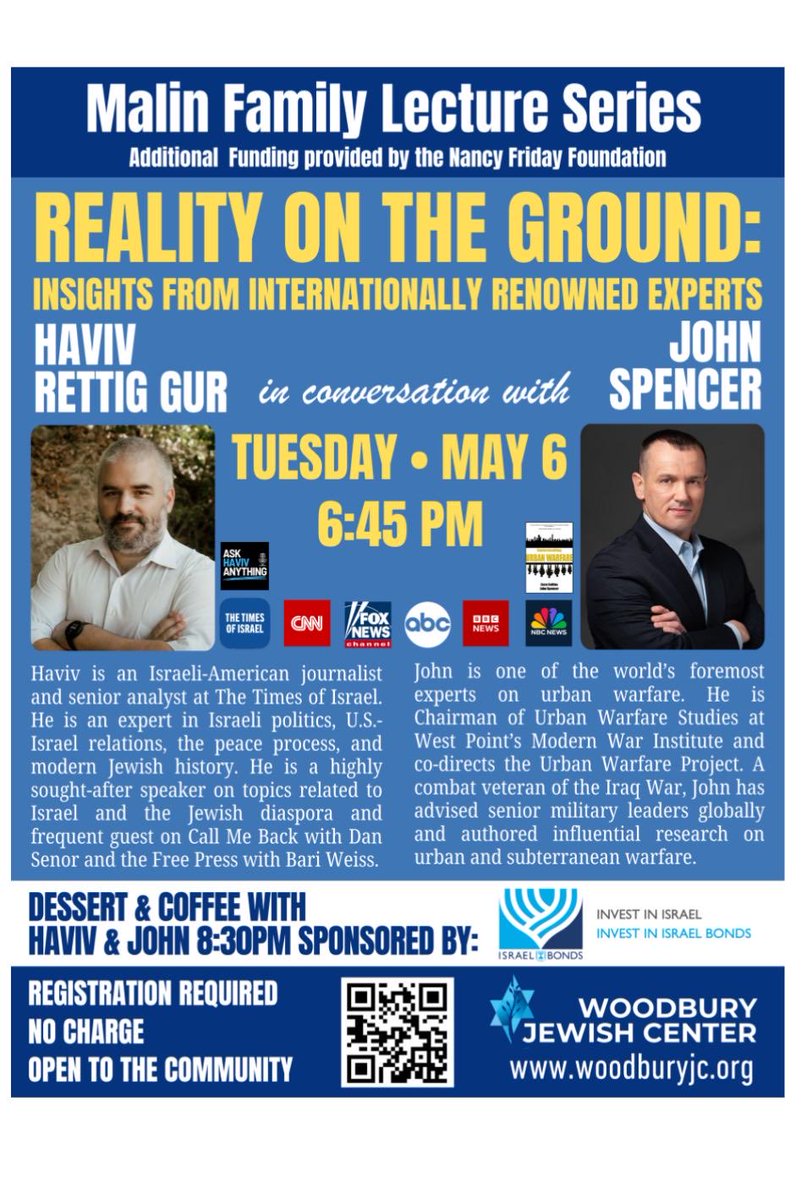 Rachel Gur @rachelgur · Twitter · 2025-04-23 22:42 UTC @havivrettiggur in conversation with the renown @SpencerGuard. Join us in Long Island on May 6. Admission is free, registration required.