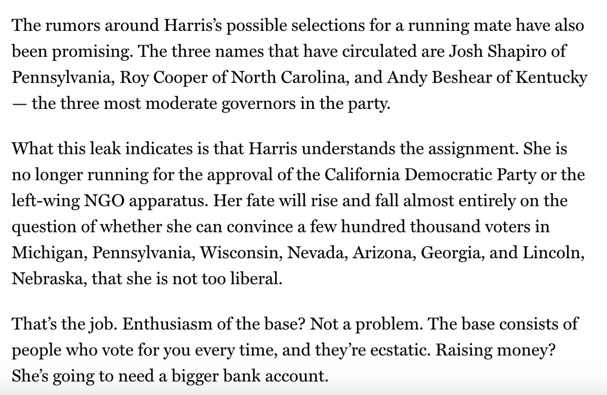 A semi-competent GOP would trap Harris in a bind: Is Harris a continuation of Biden’s progressive victories or is she trying to moderate away? Did she cover up Biden’s decline and make policy herself or was she a figurehead of a figurehead? (1/2)