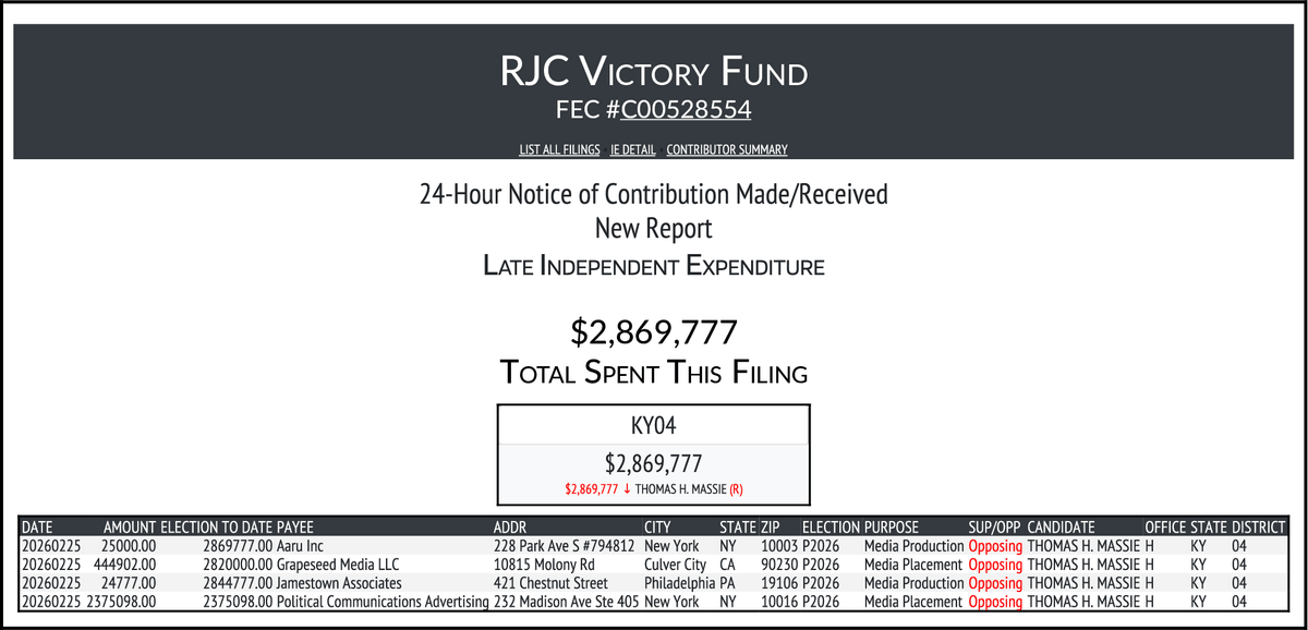 Republican Jewish Coalition Victory Fund drops a massive $2.87 million media buy hitting #KY04 incumbent Republican Thomas Massie, as total IE spending in the primary hits $6.8M, $5.16M of that reported as anti-Massie spending