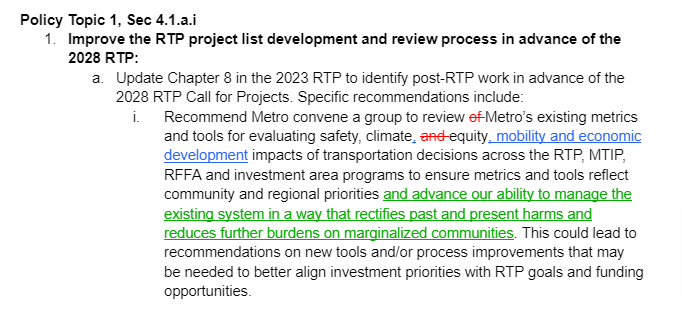 🌟Fought for improved processes which will result in a better 2028 RTP, including a reparative justice amendment (in green) which we forwarded and which was unanimously approved (ODOT was the only abstention)
