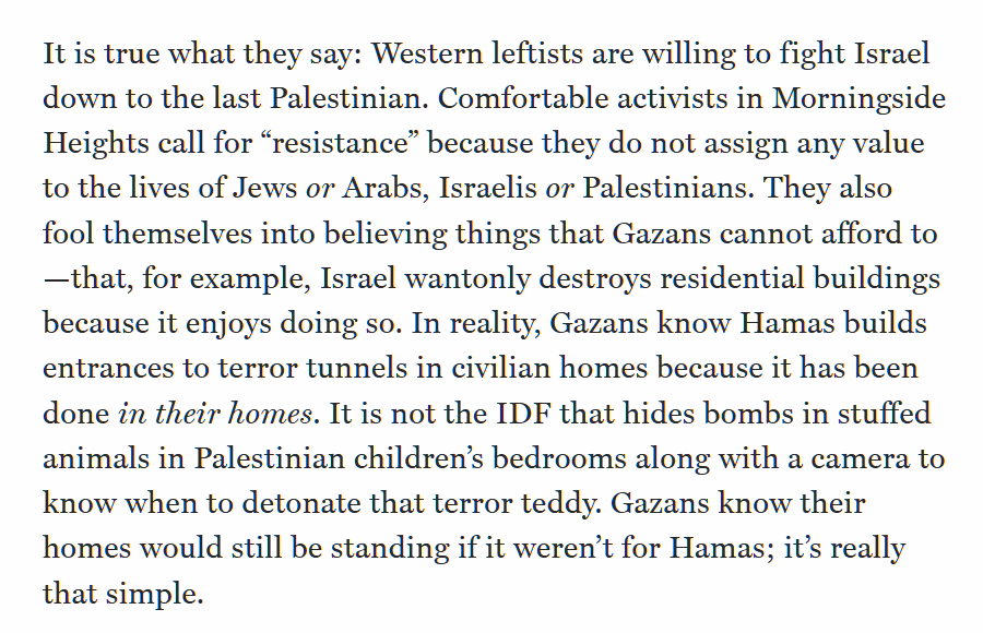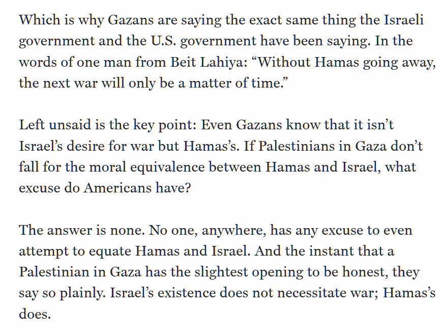 On the protests in Gaza: even the Palestinians know that Israel's presence does not necessitate war but that Hamas's does. They know who built the tunnels under their home. They know who rigged their kids' room with bombs. Unlike Western activists, they are not idiots:
