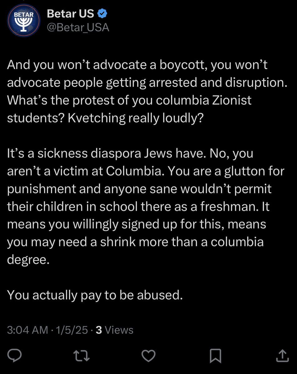 Betar claimed that I’m an “unemployable” sadomasochist who “pay[s] to be abused” because I attend @columbia. What has @Betar_USA done to support Jewish students? They seem to be wasting their time lambasting me and @ShaiDavidai. Harassing protesters and inciting violence is unproductive. So is infighting. Jabotinsky is rolling in his grave.