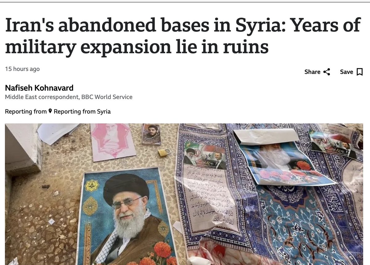 Iran's abandoned bases in Syria: Years of military expansion lie in ruins @BBCNews forgot to thank Israel. Its elite Islamic Revolutionary Guard Corps (IRGC) built deep networks of underground bases, supplying arms and training to thousands of fighters. For Iran, this was also part of its "security belt" against Israel. On the wall at the entrance of the toilets, slogans read: "Down with Israel" and "Down with the USA". Back at the abandoned base, Iran's military expansion was still under way even in the last days. Next to the camp were more tunnels under construction, apparently the beginnings of a field hospital. The cement on the walls was still wet and the paint fresh. https://www.bbc.com/news/articles/cjw4egp7lwno?utm