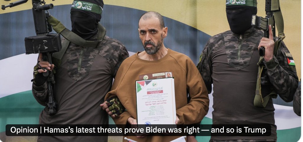 The road taken in Gaza. How all hostages are not home yet and how Hamas still believes they will emerge from their attack/invasion of Israel victorious. War is an act of force to compel your enemy to do your will. Hamas started a war. Israel must finish it. First hand account and important context about Hamas from Biden's White House coordinator for the Middle East @brett_mcgurk @washingtonpost Hamas is a terrorist group that has ruled the Gaza Strip for nearly two decades. Its Oct. 7 attack, however, was not just an act of terrorism but a full-blown military invasion. Hamas’s leaders pledged to repeat the October massacres and reportedly [statements by Hamas leaders actually] welcomed the civilian toll in Gaza to increase pressure on Israel. Hamas then rejected continuing talks unless Israel accepted a permanent truce up front, with a return to the Oct. 6 status quo. Hamas’s Iranian backers reinforced the group’s demands as it continued to attack Israel. While Hamas and its defenders claim it accepted this framework in early July, that is not true. Hamas reinserted demands for a permanent truce. And in those negotiations, it never — not once, even where nearly every Hamas only engaged seriously on issues it cared about, such as Israel’s military positions during a ceasefire, or mechanisms at border crossings. Nor did Hamas seem to care about the civilians of Gaza, whose suffering would be greatly alleviated by a stop to the fighting and the surge in humanitarian supplies that the ceasefire would enable. Hamas’s leader Yahya Sinwar — the mastermind of the Oct. 7 attacks, and an obstacle to any hostage deal — was killed in southern Gaza, not far from where Goldberg-Polin died. By Jan. 19, one day before Trump’s inauguration, the ceasefire took effect, and hostages began to come home. The talks ultimately succeeded because the military equation across the region changed, with Hamas isolated and no longer able to count on a multifront conflict. The only way to end this war is for Hamas to continue releasing hostages and accept terms...That means a Gaza without Hamas in charge. https://www.washingtonpost.com/opinions/2025/02/14/biden-trump-hamas-gaza-hostages/