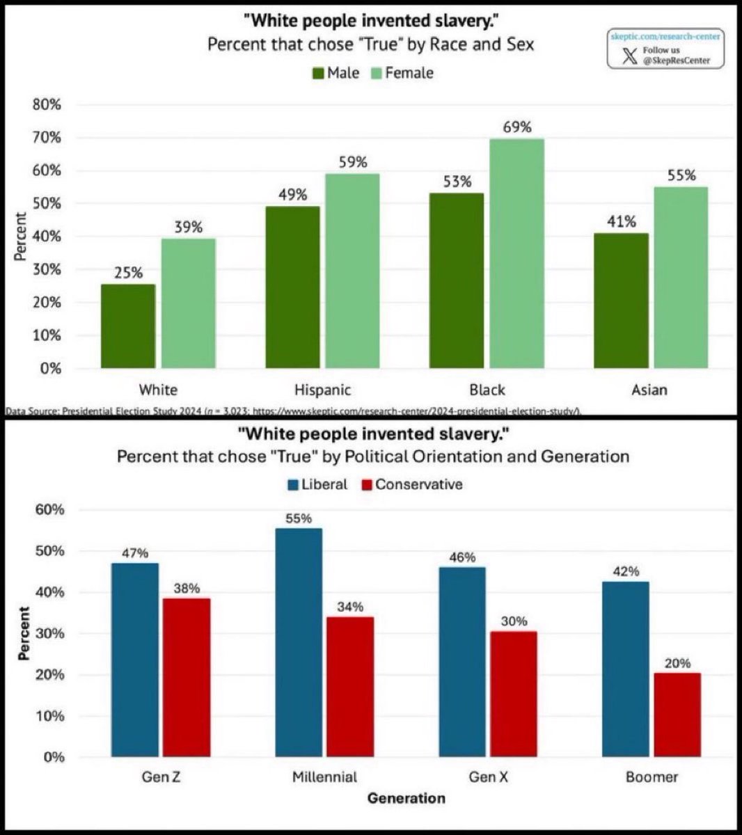 • The Rabbit Hole @therabbithole · Twitter · 2026-03-02 14:16 UTC Most Hispanic, Black, and Asian women think “white people invented slavery.” Most Liberal Millennials think the same.