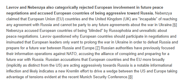 Russian Foreign Minister Sergei Lavrov Russian Permanent Representative to the United Nations Vasily Nebenzya also categorically rejected European involvement in future peace negotiations and accused European countries of being aggressive toward Russia. Russian authorities have previously focused their information operations against NATO, accusing the alliance of conspiring and preparing for a future war with Russia. Russian accusations that European countries and the EU more broadly (implicitly as distinct from the US) are acting aggressively towards Russia is a notable informational inflection and likely indicates a new Kremlin effort to drive a wedge between the US and Europe taking advantage of tensions evident at the recent Munich Security Conference.