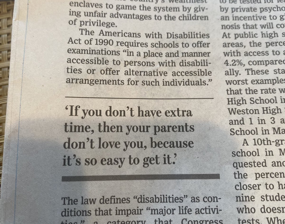 Extra time as accommodation makes a farce of testing. A two-tiered evaluation system can never be fair or equal. If the time limit is relevant to a test, it must be applied equally to every student or applicant.