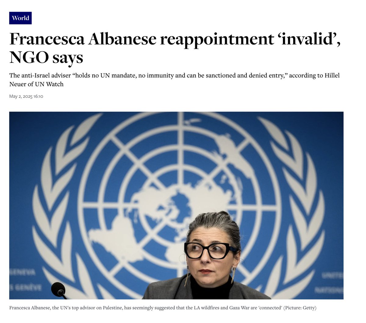 Francesca Albanese reappointment ‘invalid’, NGO says: Because the UNHRC chair violated his legal duty to act on formal complaints by the U.S. Congress, Argentina, Hungary, Israel & UN Watch, her stated renewal was illegal—and she no longer has immunity. https://www.thejc.com/news/world/francesca-albanese-reappointment-invalid-ngo-says-wdkbtywf