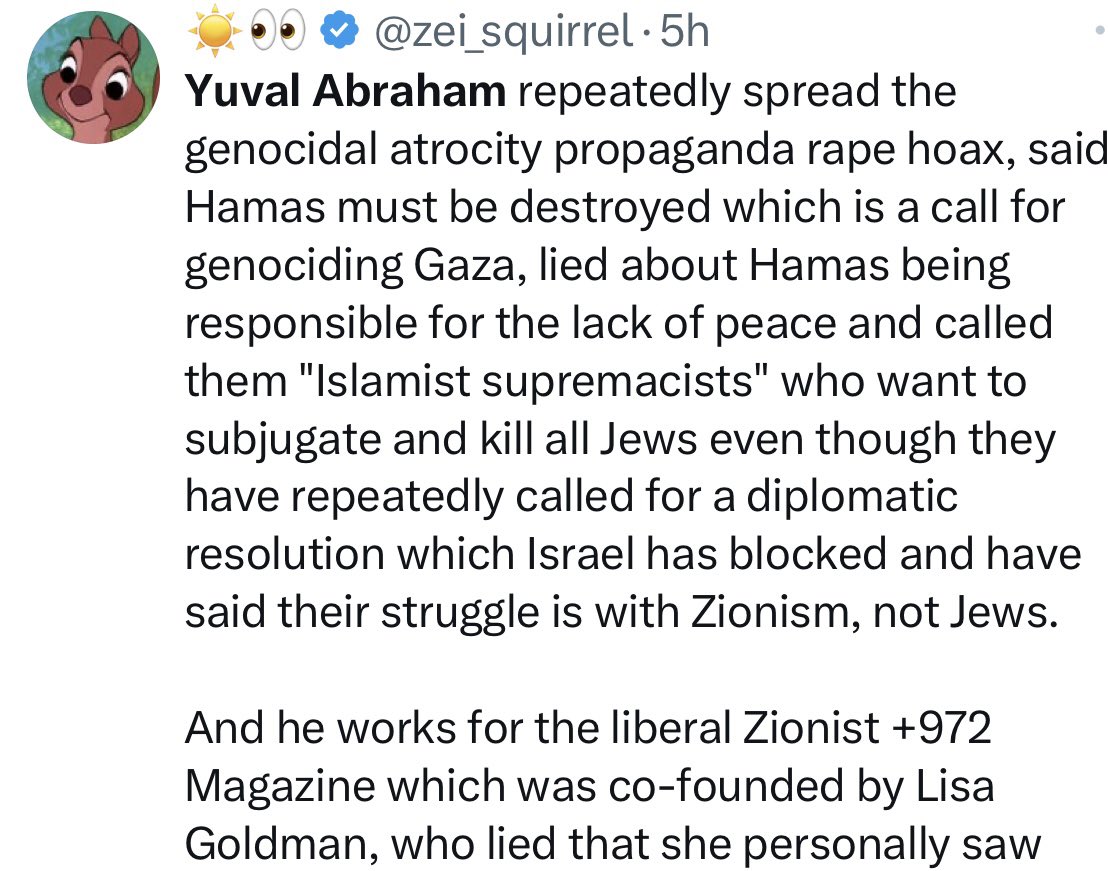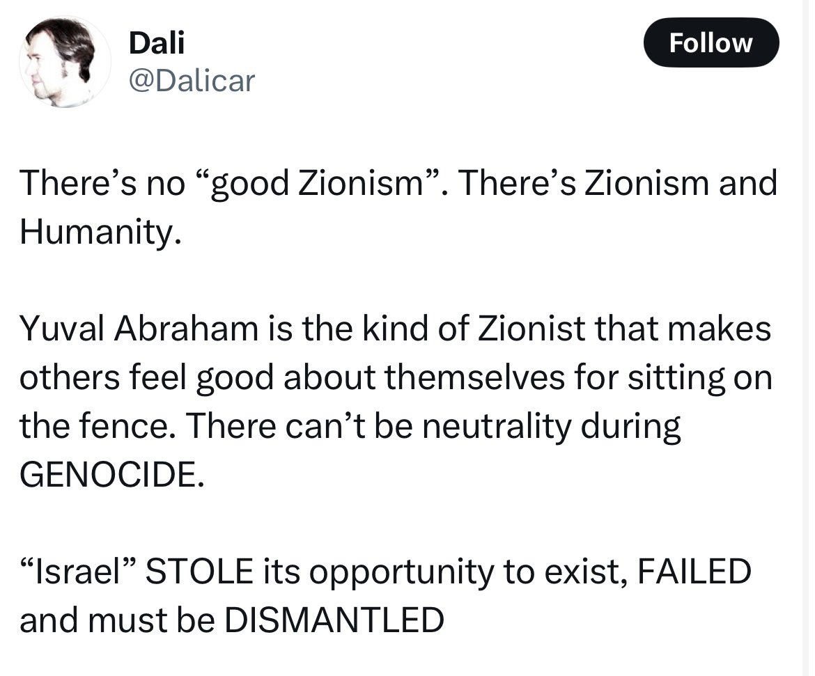 It’s kinda funny but not surprising, that most of the hate that Yuval Abraham is receiving now is actually from the pro Palestine movement. @yuval_abraham might think that his activism will make him likable or cool, but the pro Palestinians will always hate him for being a Jew.