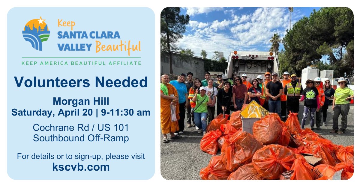 Celebrate #EarthDay 🌎 weekend by joining us, @CityofMorganHil, @CaltransD4, and @CHP_GoldenGate in beautifying South County at our upcoming highway #cleanup event! http://kscvb.com 📅 April 20 | 9-11:30 am 📍 Cochrane Rd / US 101 Southbound Off-Ramp
