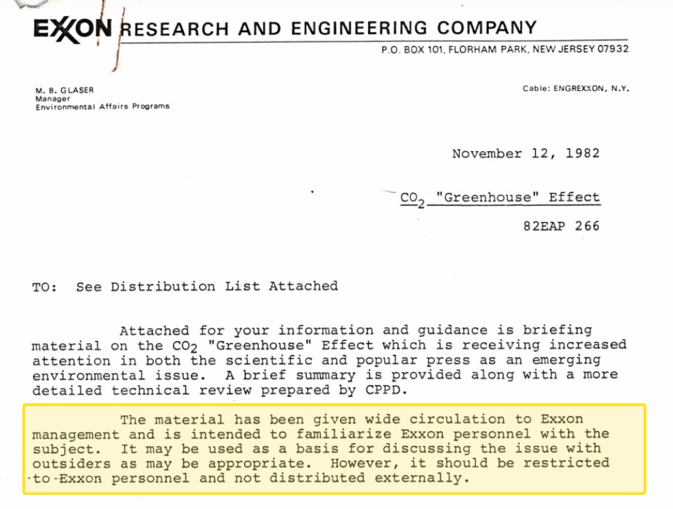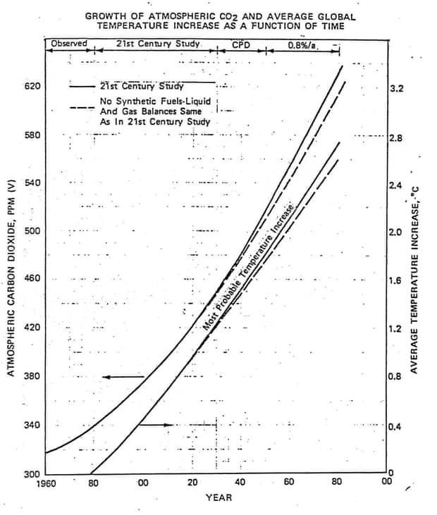 In 1982, a report was sent out to Exxon management which showed that burning fossil fuels and clearing forests was causing increased CO2 in the atmosphere, and projected that global temperatures could rise above 3°C by the end of the 21st century