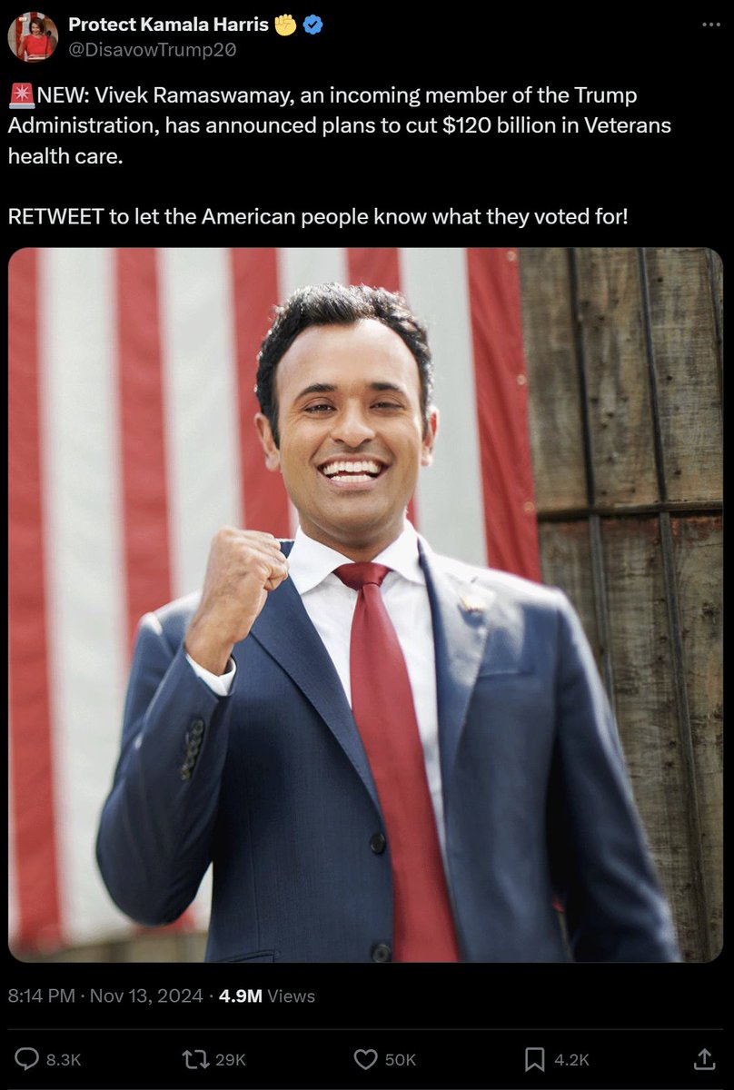 This is not true. Vivek floated the idea of cutting programs whose congressional authorization has expired. People who actually know how government works pointed out that this would implicate veterans funding. Vivek did not say he'd cut that and is not dumb enough to do it. This isn't 2016. We don't need to elevate grifter progressive accounts that invent Trump offenses, profiting off panic to juice their followings while actually ensuring that real offenses get less attention.