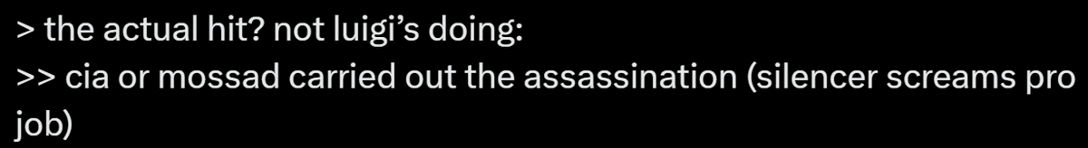 i haven't slept > be luigi nicholas mangione > born 1998, maryland > family is loaded—grandfather built golf resorts and luxury clubs > grows up in towson, goes to elite private school (gilman) > $40k/year tuition but worth every penny—valedictorian 2016 > classmates describe him as “inventive, courageous, charming” > ivy league material, gets into upenn > studies computer science and math, minors in philosophy (red flag?) > co-founds a game dev club, works on ai competitions (halite iii) > perfect chad: handsome, athletic, ambitious > graduates in 2020 with a bs/ms combo—dream life unlocked > lands data engineer job at truecar, moves to san francisco > 2021: cracks start forming > gets into surfing accident while on vacation in hawaii > chronic low back pain (clbp) becomes his entire personality > can’t work out, can’t sit, can’t live like a normal chad anymore > goes through the healthcare system hellscape—insurance denies surgery > spends on specialists, treatments fail, pain keeps getting worse > resentment grows, starts ranting about “parasite healthcare execs” > gets weirdly into niche books: >> “crooked: outwitting the back pain industry” >> “back mechanic” by stuart mcgill >> ted kaczynski’s *industrial society and its future* (4 stars on goodreads) > posts online about banning porn (“toxic masculinity is under attack”) > follows erowid, explores psychedelics for “self-healing” > tweets get spicier, but no one pays much attention > 2022: goes on an ayahuasca retreat > desperate for relief, looking for answers beyond medicine > claims he “saw God” during the trip but also fought off shadowy entities >> describes these as “6D demons” trying to implant ideas into his mind >> later tweets cryptic things like: >>> “not all pain is physical” >>> “they feed on fear, but you can push them back if you see their shape” >>> “healthcare is only a part of the cage” > friends think he’s having a spiritual awakening, but vibe gets darker > deletes most of his old tweets, only posts sporadically after this > by 2023, he’s fully withdrawn, but *something about him seems different* >> doesn’t talk about the demons anymore, like the memory was scrubbed > 2023: leaves truecar, moves to hawaii permanently > broke, depressed, living off savings, spiraling quietly > becomes a ghost online—posts less, deletes a lot of old tweets > but what’s left feels curated, too on-brand (weird foreshadowing?) > december 4, 2024: unitedhealthcare ceo brian thompson assassinated > shot outside hilton midtown hotel in broad daylight > december 9: luigi arrested at mcdonald’s in altoona, pennsylvania > found with: >> 3d-printed ghost gun (zero serial numbers, spooky tech vibes) >> silencer >> fake ids (plural, why?) >> handwritten manifesto blaming healthcare execs for “killing americans” --- > here’s where it gets *weird* > the manifesto: >> calls ceos “parasites” and “powerful abusers” >> apologizes for “any trauma caused” but says “this had to happen” >> specifically names unitedhealthcare as the enemy of the people > but... it reads like something out of a hollywood movie: >> too polished, too coherent for a supposed back-pain-ridden maniac >> no spelling errors, perfect grammar, emotional yet calculated—sus > timeline doesn’t add up: >> luigi’s last known address was in hawaii. how does he suddenly turn up in nyc? >> uses a fake id to check into a hostel near the crime scene—how convenient >> goes *from hawaii to nyc to pennsylvania* in a matter of days >> gets caught at a mcdonald’s after a nationwide manhunt. really? > ghost gun raises red flags: >> why would a guy like luigi—ivy grad, tech-savvy, spotless record—print a gun? >> ghost guns are perfect deep state props: untraceable, terrifying, buzzword-worthy >> feels like a setup to push the “diy domestic terrorism” narrative > his social media suddenly blows up: >> goodreads reviews of ted kaczynski go viral after the arrest >> tweets about healthcare and porn resurface, painting him as a “radicalized genius” >> but the timing feels off—like it was *meant* to create this image > friends and family shocked: >> “he was a good kid,” “never showed signs of violence,” “always so bright” >> doesn’t fit the profile of a guy who’d snap and assassinate a ceo --- > it’s a psyop > luigi is the perfect recruit: >> ivy league pedigree = media catnip, relatable to both elites and normies >> chronic pain = universal sympathy, emotional hook for the masses >> anti-healthcare sentiment = taps into leftist rage against capitalism >> manosphere vibes = taints the right with “toxic masculinity” optics >> erowid + psychedelics = mkultra callback, easy to manipulate mindset > the 6D demon fight was part of the setup: >> ayahuasca trip wasn’t self-healing—it was an astral battleground >> cia or another deep-state group planted the entities to “break” his spiritual defenses >> they didn’t just want to brainwash him—they wanted to hollow him out completely >> the fight left cracks in his psyche, making him easier to manipulate afterward >> his cryptic tweets (“they feed on fear”) were cries for help before they fully got to him > by the time of the ceo murder, he’s fully under their control. >> either the demons broke him, or the deep state leveraged the battle to finalize his reprogramming > the actual hit? not luigi’s doing: >> cia or mossad carried out the assassination (silencer screams pro job) >> luigi’s memories implanted to make him the fall guy >> ghost gun planted as evidence to tie him to the crime --- > why this psyop now? > because right vs left was collapsing: >> trump united silicon valley libertarians, populists, unions, and vc bros >> woke politics were dying, and no one cared about identity battles anymore >> deep state needed a new cultural fracture to maintain control > solution: a class war >> kill a ceo, 