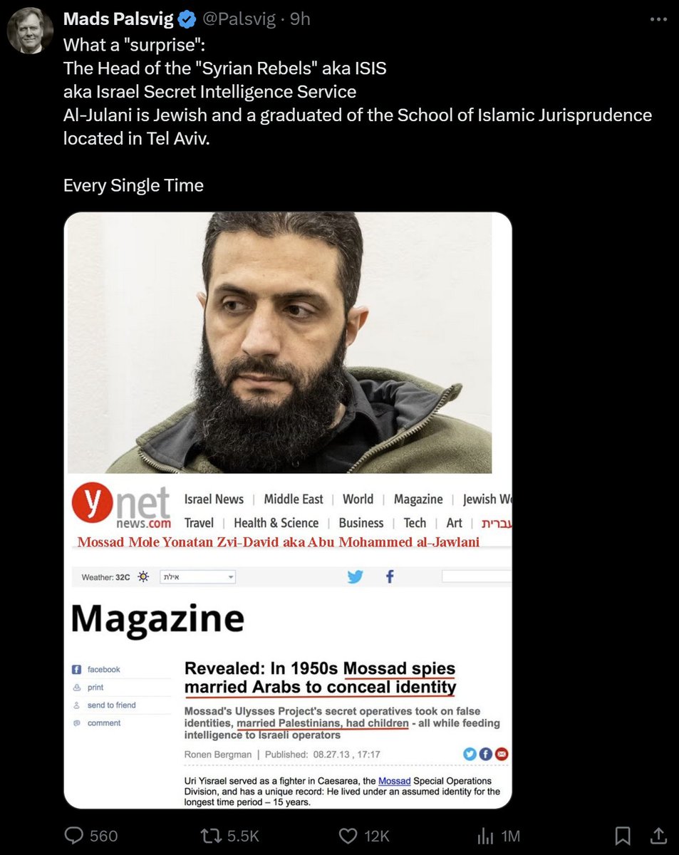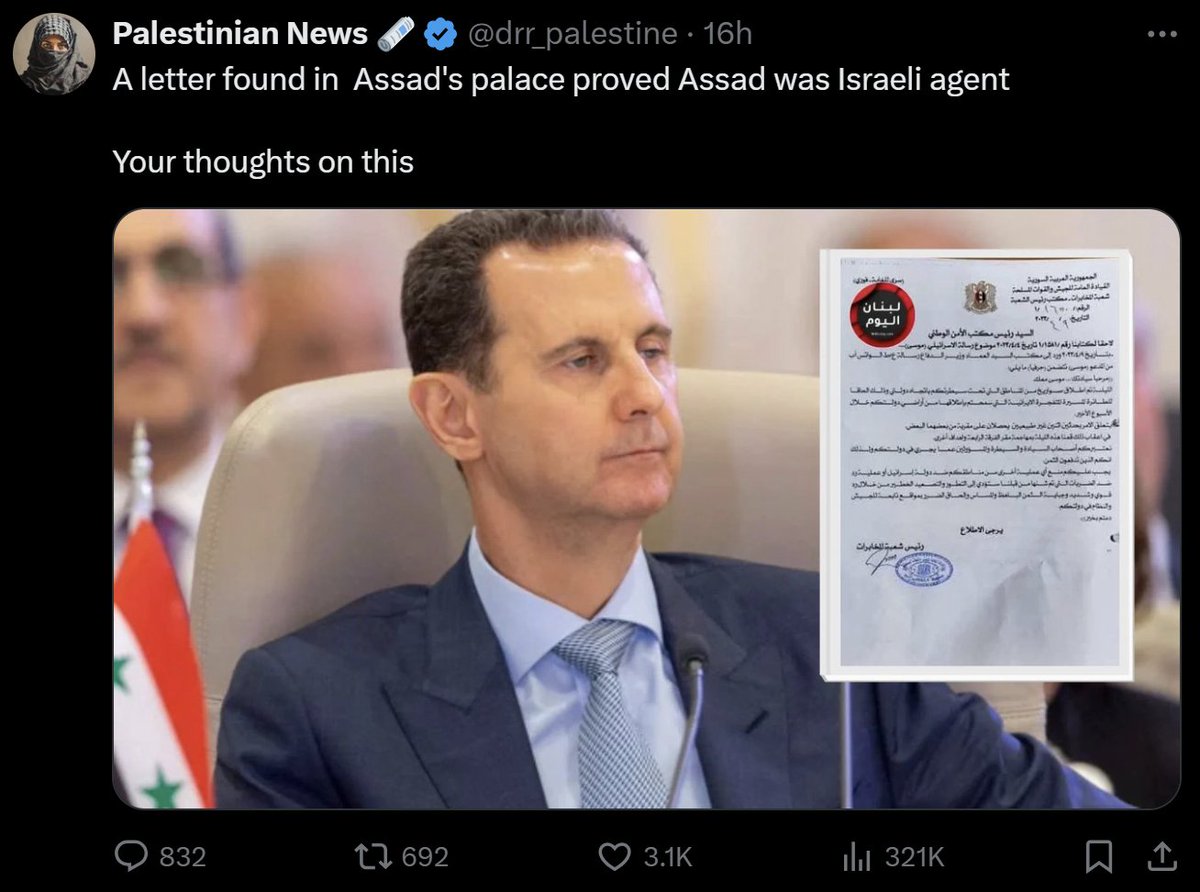 Yair Rosenberg @yair_rosenberg · Twitter · 2024-12-12 21:49 UTC I am just asking the internet's antisemites to make up their minds about whether Bashar Assad or the guy who overthrew Bashar Assad is the Mossad mole.